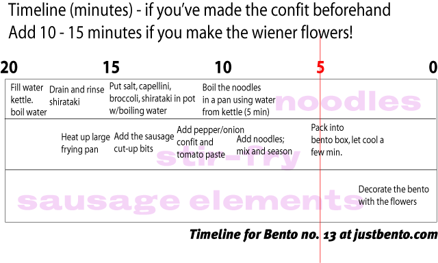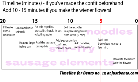 The flower-shaped wieners do take time to make. It took me about 15 minutes to make 4 of them. So you need to add this to your calculations. If you just cut up the wieners instead this bento can be made quite comfortably within 15 minutes. Allow 30 minutes at least with the flowers. (Step-by-step directions for the wiener flowers.)